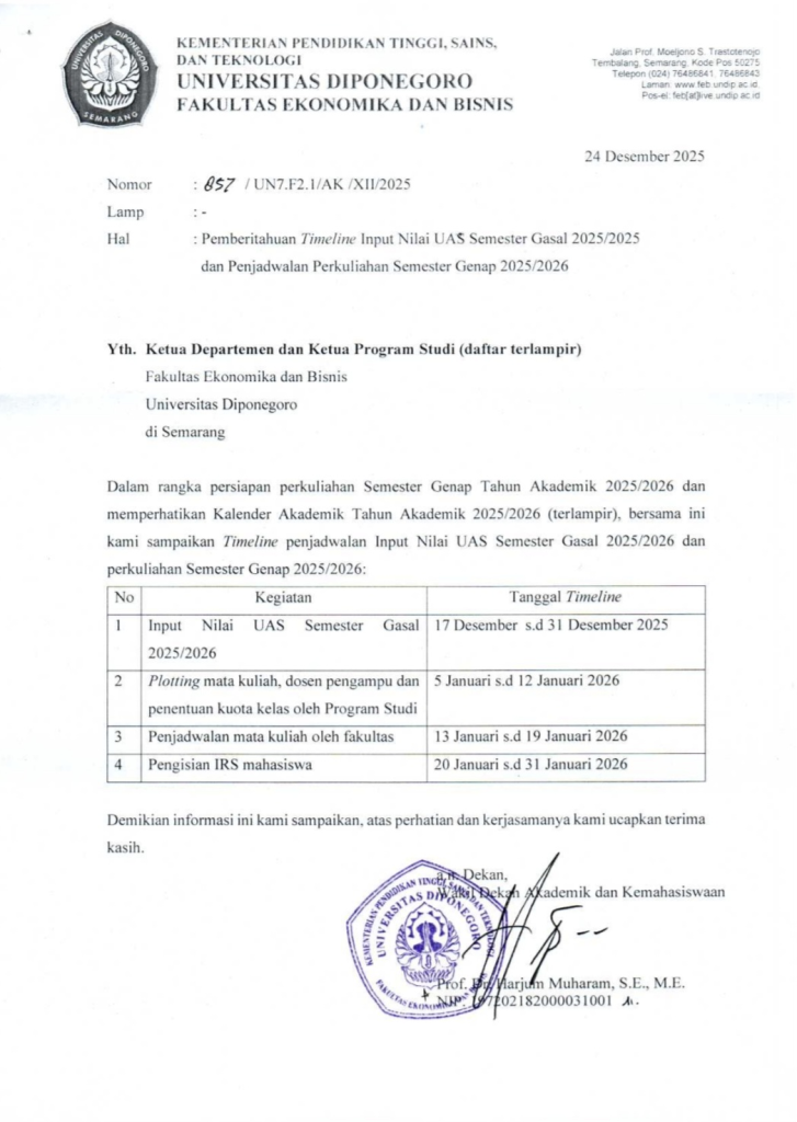The Faculty of Economics and Business (FEB) hereby conveys academic information to all lecturers and members of the academic community regarding the timeline for submitting Final Examination (UAS) grades for the Odd Semester of the 2025/2026 Academic Year as well as the course scheduling for the Even Semester of the 2025/2026 Academic Year.